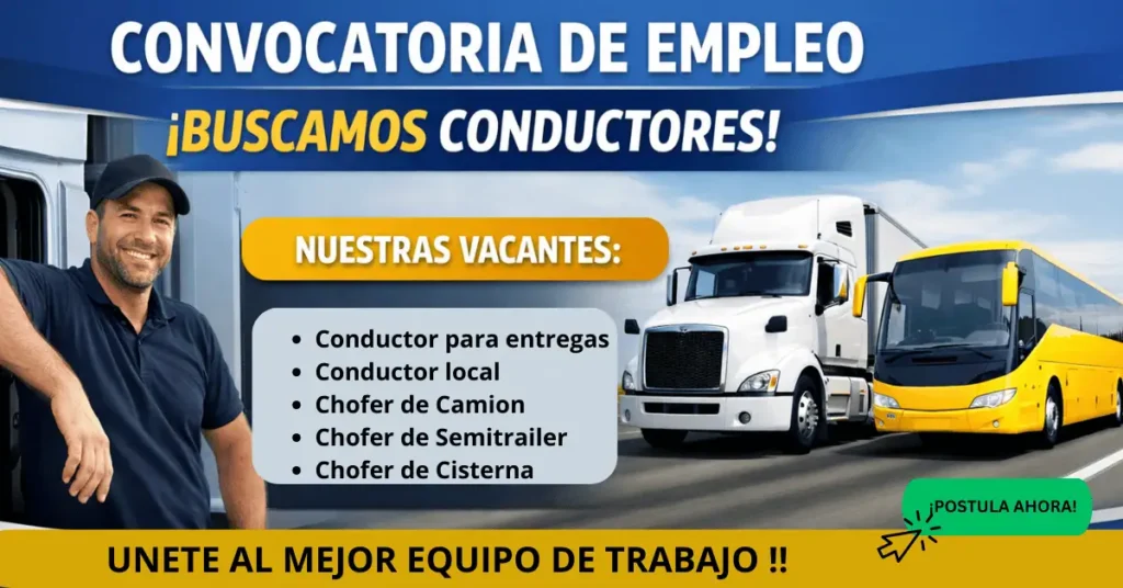 Vacantes para conductores profesionales con estabilidad laboral, beneficios competitivos y capacitación constante en transporte urbano, escolar, ejecutivo y de carga, garantizando seguridad y crecimiento profesional.